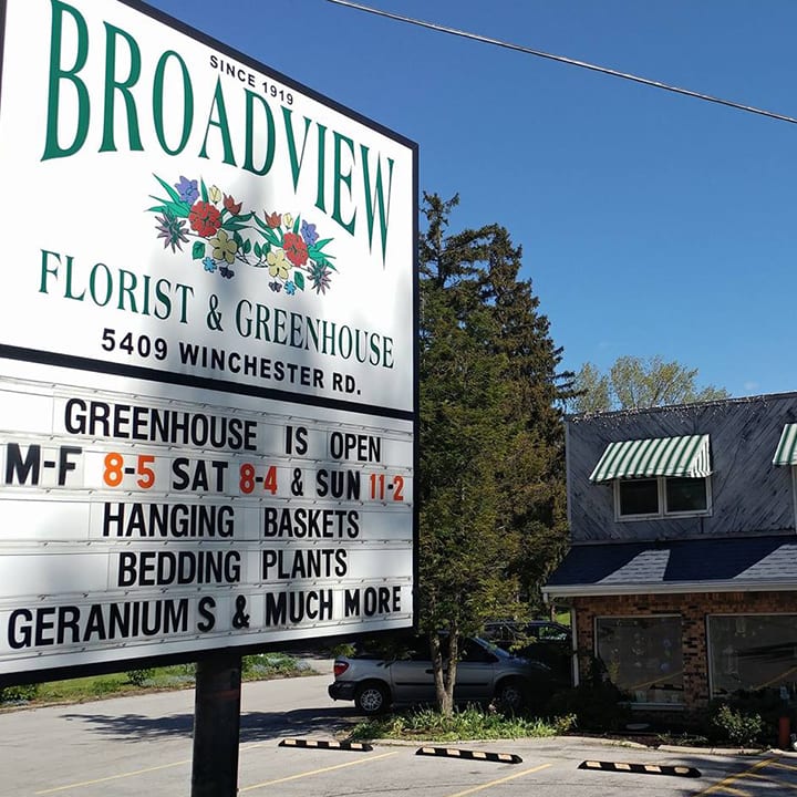 The garden center and greenhouses truly are mainstays of Broadview Florist and Greenhouse that hearken back to the early 20 th century when Broadview began mostly as a fruit and vegetable "stand" with some livestock in 1919. You won't find any cows, pigs or chickens (yet), but beginning at the end of April through the start of June you will find bedding and vegetable flats, along with a few fruit plants, and thousands of vibrant accent plants and colorful flowering plants ready for you to accentuate your homes and gardens. Come visit the garden center and greenhouses Monday through Friday from 8am-5pm, Saturday from 8am-4pm, and Sunday from 11am-2pm.